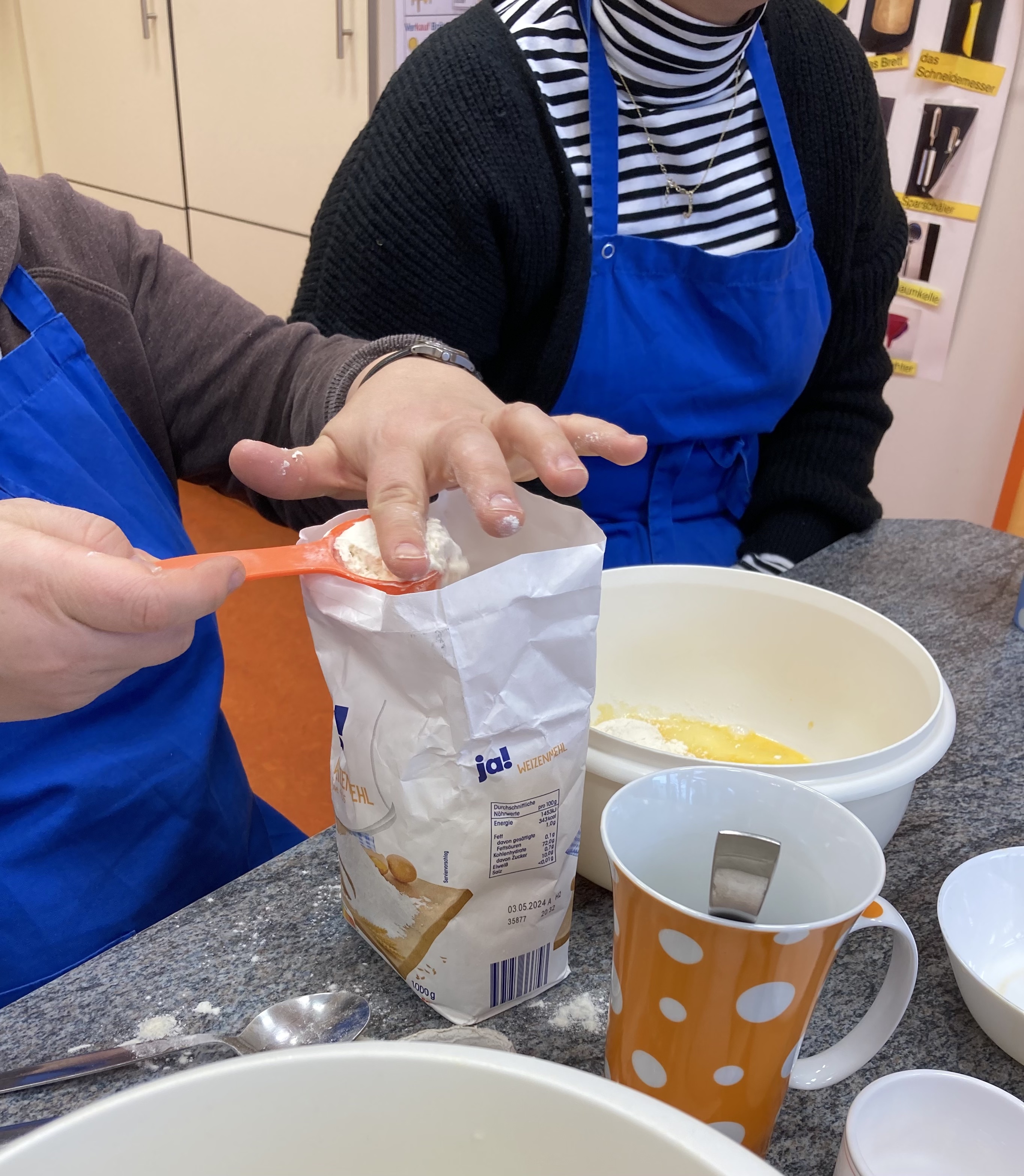 Eine Lehrerin streift von einem speziellen Löffel (Messlöffel) das Mehl mit dem Finger runter.