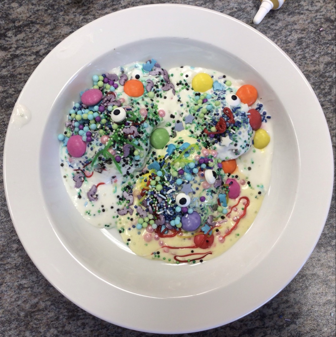 Ein Teller mit zwei Eiskugel, die unter bunten Schokolinsen, Augen aus Zuckerguss, bunten Streuseln in unterschiedlichen Größen, kleinen Zuckersternen sowie Lebensmittelfarbestreifen verdeckt sind.