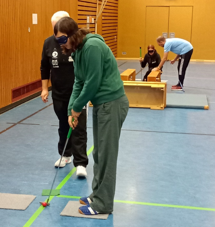 Eine Frau trägt eine Augenbinde. Sie hält einen Minigolfschläger in der Hand und legt diesen an den Minigolfball an.