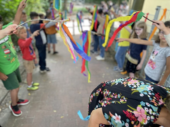 Zum Abschluss standen alle Grundschulklassen mit bunten Bändern Spalier, während die erste Klasse froh in ihre ersten Unterrichtsstunden ging .