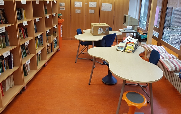 Die Bücherei hat normalerweise freitags in der ersten großen Pause geöffnet, manchmal auch zu Regenpausen und einige Klassen verbringen hin und wieder ihre Betreuungszeiten dort.